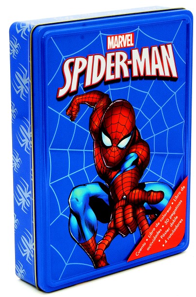Esta caja metálica contiene un libro de cuentos de 32 páginas, un libro de colorear de 24 páginas y un libro de actividades de 24 páginas. Incluye también 4 rotuladores de colores, un póster doble y una hoja de adhesivos. ¡Pásalo en grande junto al hombre araña! ¡Acción, heroísmo y diversión!