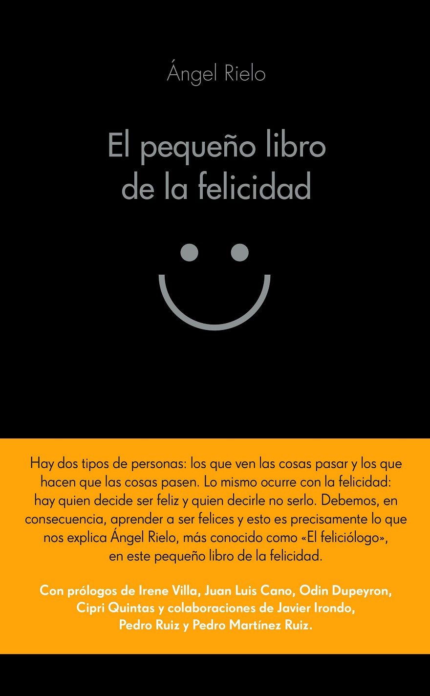 Hay dos tipos de personas: las que ven las cosas pasar y las que hacen que las cosas pasen. Lo mismo ocurre con la felicidad: hay quien decide ser feliz y quien decide no serlo. La felicidad no es un don sobrenatural, un bien del que solo pueden disfrutar unos pocos privilegiados. Existen determinadas actitudes y predisposiciones mentales que alimentan la felicidad, y cultivarlas está al alcance de todos, como demuestra en este libro el cómico y guionista Ángel Rielo. Cuando el mal humor, la agresividad y la ley del más ladrador imperan, cuando la gente va por el mundo con cara de perro, este pequeño manual hace bandera de todo lo contrario: el positivismo, el optimismo y la alegría pueden lograr grandes transformaciones, empezando por nosotros mismos. Un libro que combina teoría y práctica, datos y anécdotas ¡para que te conviertas en todo un feliciólogo!