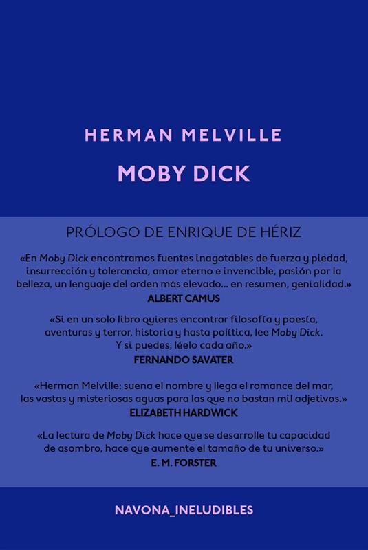 Moby Dick narra la travesía del barco ballenero Pequod, comandado por el capitán Ahab, en su obsesiva y autodestructiva persecución de un gran cachalote blanco. Publicada en 1851, la novela incluye pormenorizadas descripciones sobre la caza de las ballenas y otros detalles de la vida marinera. Quizá por ello no tuvo demasiada acogida en su primera publicación, aunque con posterioridad haya servido para cimentar la reputación del autor y situarlo entre los mejores escritores estadounidenses. Hoy está considerada una obra maestra que abrió nuevos senderos a la narrativa. La frase inicial del narrador —«Llamadme Ismael»— se ha convertido en una de las citas más conocidas de la literatura en lengua inglesa.