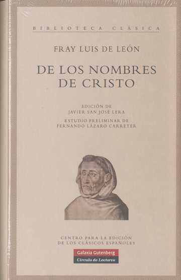 De los nombres de Cristo es la única de las obras castellanas del autor publicada en vida del propio Fray Luis de León, a quien Cervantes proclamaba ®un ingenio que al mundo pone espanto¯ y Lope de Vega el ®honor de la lengua¯. La prosa de Fray Luis tiene su cumbre en este libro, considerado a lo largo de los siglos ejemplo de elegancia y sabiduría, pero que modernamente, sin embargo, ha sido más citado que leído. Javier San José sitúa pormenorizadamente los aspectos esenciales de la obra en su contexto histórico-literario y la anota punto por punto para explicarla y acercarla al lector de hoy. El texto crítico se establece teniendo presentes todas las ediciones anteriores y haciéndose cargo de las peculiaridades de la tipografía en el siglo XVI. Los índices dan cuenta del inmenso caudal erudito que Fray Luis reúne. De los nombres de Cristo se nos aparece así en toda su plenitud como uno de los monumentos fundamentales del humanismo europeo y de la literatura española de todos los tiempos. (Del estudio preliminar de Fernando Lázaro Carreter).