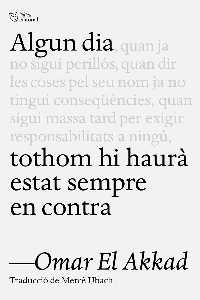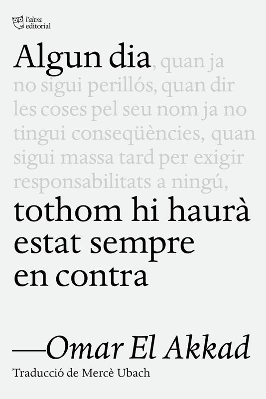 Com a immigrant nascut a Egipte i instal·lat al món occidental des de molt jove, Omar El Akkad estava convençut que Occident era una terra de llibertat i justícia. Però en els últims vint anys, durant els quals ha exercit de periodista en primeríssima línia i ha sigut testimoni de la matança indiscriminada de la població de Gaza per part d’Israel, ha arribat a la conclusió que la base moral sobre la qual s’ha erigit el món Occidental és una gran mentida. Algun dia tothom hi haurà estat sempre en contra és una crònica punyent i incomòda que clama contra el silenci eixordador dels mitjans de comunicació europeus i americans, de la classe política en general —i, molt concretament, de les esquerres benpensants—, i denuncia la incapacitat i les trampes del llenguatge a l’hora de descriure les atrocitats que s’estan cometent a Gaza i les consequ¨ències devastadores de no prendre partit, de no mullar-se i, en definitiva, de no empatitzar amb els altres. Un llibre cru i trasbalsador, imprescindible.